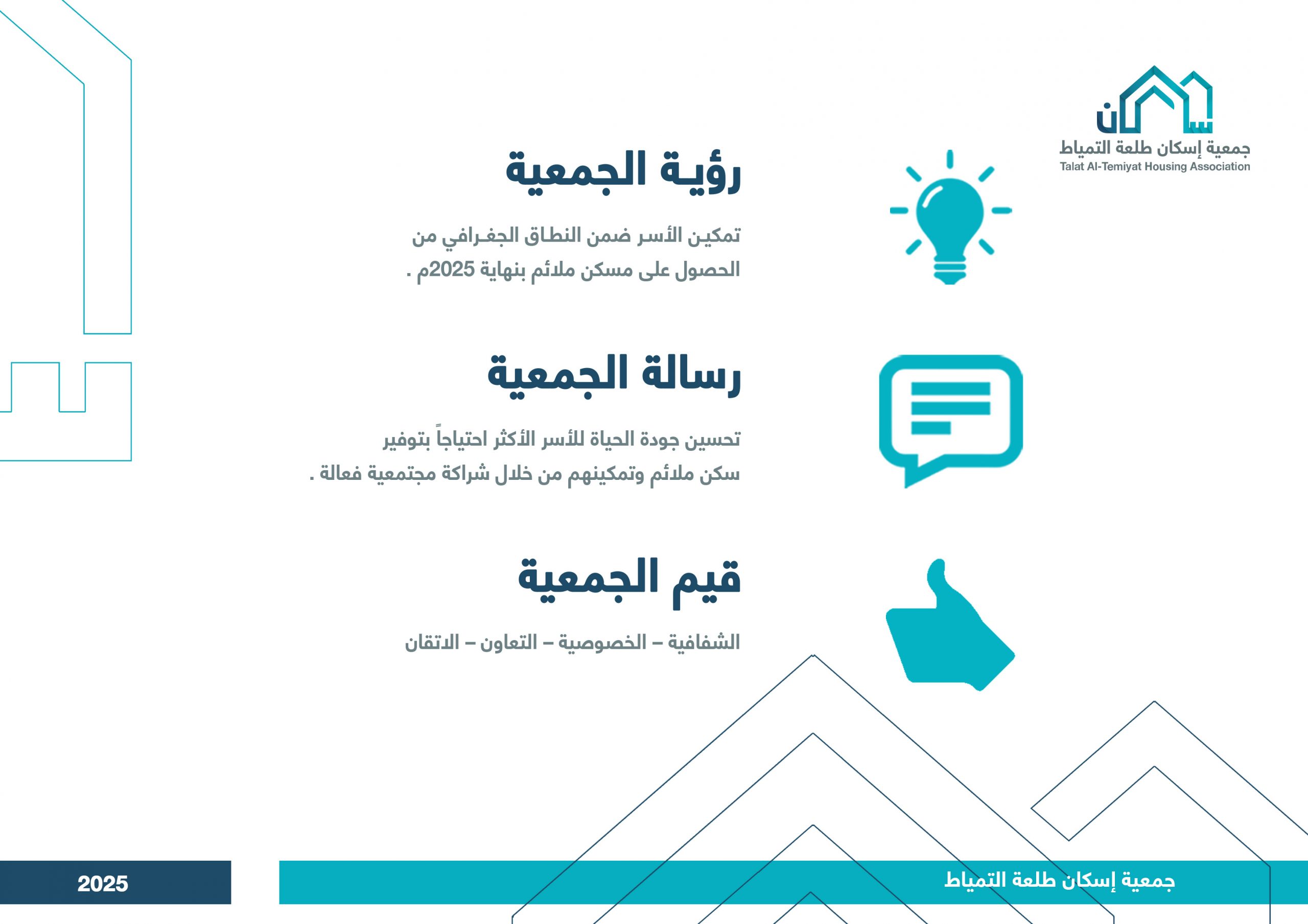 الرؤية : تمكين الاسر ضمن النطاق الجغرافي من الحصول على مسكن ملائم . الرسالة : تحسين جودة الحياة للأسر الأكثر احتياجاً بتوفير سكن ملائم وتمكينهم من خلال شراكة مجتمعية فعالة . القيم : الشفافية – الخصوصية – التعاون – الاتقان .